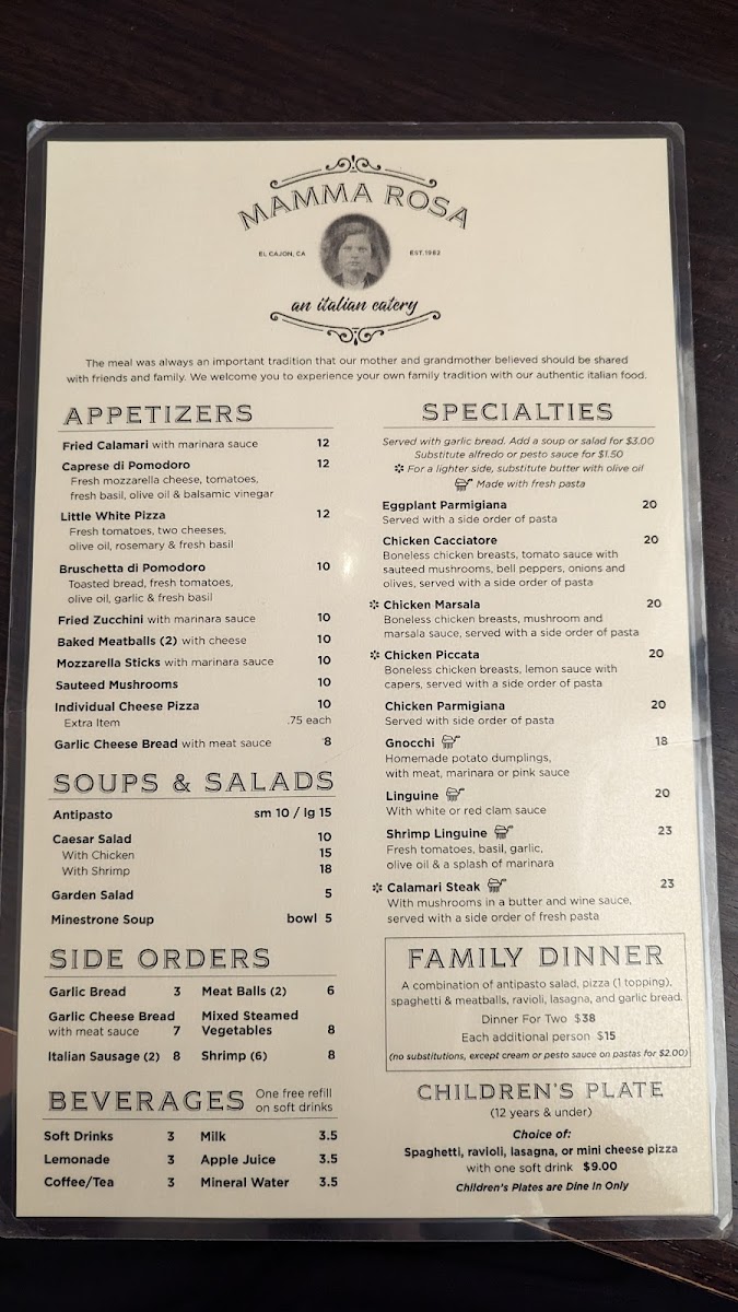 Welcome to Mamma Rosa Italian Restaurant, a hidden gem located at 1773 E Main St, El Cajon. This delightful eatery brings authentic Italian flavors and warm hospitality right to your table. Their menu features a marvelous array of classic pizzas, including the mouthwatering Mamma Rosa Special, loaded with pepperoni, sausage, and fresh veggies, all topped with real Mozzarella cheese and a homemade seasoned tomato sauce.